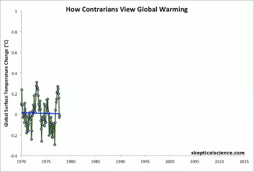 Wegen der natürlichen Schwankungen im Klimasystem gibt es innerhalb einer langfristig nach oben zeigenden Temperaturkurve (die rote Linie in Abbildung 1) häufig auch kürzere Intervalle, in denen der Trend stabil oder gar abnehmend zu sein scheint (die blauen Trendlinien in Abbildung 1). Durch geschickte Auswahl eines Start- und Endjahres lässt sich also immer mal wieder für einen gewissen Zeitraum eine Pause oder gar ein Ende der Erderwärmung behaupten.