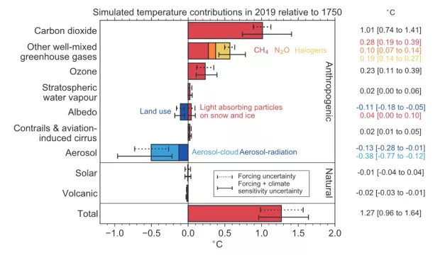 Demnach haben allein die Emissionen von Kohlendioxid rund ein Grad Celsius Temperaturanstieg verursacht, andere Treibhausgase wie Methan ein weiteres halbes Grad. Aerosole (also winzige Staubpartikel, zum Beispiel aus Kraftwerken) hatten hingegen eine kühlende Wirkung von etwa einem halben Grad Celsius. Der Einfluss der Sonne (und übrigens auch von Vulkanen) war insgesamt sehr klein – der entsprechende Balken in der Grafik (dritte Zeile von unten, "Solar") ist fast nicht zu erkennen.