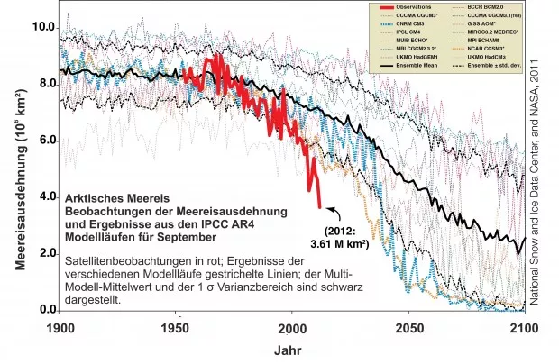 Auch die Schmelze des arktischen Meereises während der Sommermonate ist weitaus stärker und schneller ausgefallen, als einst in Klimamodellen vorhergesagt (Abbildung 7).