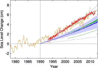 Abbildung 6: Veränderung des Meeresspiegels – Gezeitenpegelmessungen sind orange dargestellt, die erst seit Anfang der neunziger Jahre vorliegenden Satellitendaten rot. Die blaue Fläche zeigt die Projektionen des Dritten IPCC-Reports von 2001 (mit der blauen Linie als Mittelwert), die grünen Linien zeigen entsprechend Ober- und Untergrenze sowie Mittelwert aus dem Vierten IPCC-Sachstandsbericht. Die reale Entwicklung lag am oberen Rand bzw. über vorherigen Modellprojektionen; Quelle: Rahmstorf et al. 2012