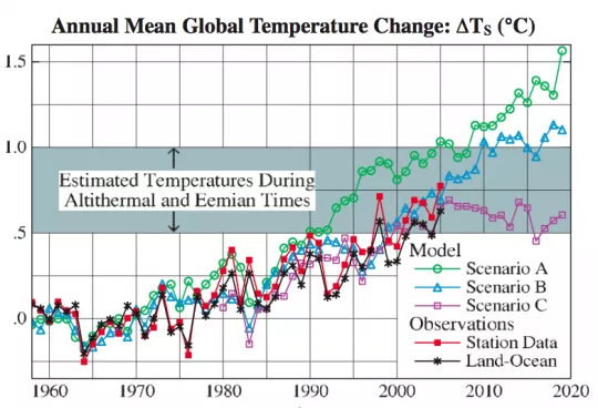 Die engste Korrelation mit den später real gemessenen Temperaturen zeigte Hansens Szenario B. Dieses hatte er einst selbst für die wahrscheinlichste Variante gehalten, und es stimmte dann tatsächlich am stärksten mit den realen CO2-Emissionen überein. Zwar gibt es bei den Temperaturkurven von Jahr zu Jahr Abweichungen – diese sind jedoch zu erwarten. Die unberechenbare Natur des Wetters mag die Bestimmung des menschlichen Einflusses erschweren, doch die Tendenz insgesamt ist kalkulierbar.
