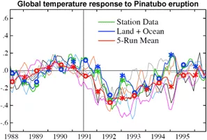 Mit dem Ausbruch des philippinischen Vulkans Pinatubo im Jahr 1991 bot sich die Chance herauszufinden, wie zutreffend die Vorhersagen von Modellen über die Auswirkungen von Sulfat-Aerosolen auf das Klima sind. Ergebnis: Die Modelle sagten ziemlich akkurat die vorübergehende weltweite Abkühlung von ca. 0,5 °C voraus, die bald auf den Ausbruch folgte (siehe Abbildung 5). Mehr noch: Auch die Rückkopplungseffekte etwa von Sonneneinstrahlung und Wasserdampf, die in die Modelle eingeflossen waren, wurden quantitativ bestätigt (Hansen et al. 2007).