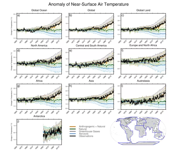 Abbildung 3: Vergleich der beobachteten und simulierten Erhitzung der Welt (obere Reihe Mitte), der Weltmeere (oben rechts) und der globalen Landmassen (oben rechts) sowie für sieben Einzelkontinente; die dicke, schwarze Kurve zeigt die real gemessenen Temperaturen bzw. deren Veränderung – sie verlaufen sehr nah an den Ergebnissen von Klimamodell-Berechnungen, die natürliche und menschliche Einflüsse berücksichtigen (bräunlich eingezeichnet); Quelle: IPCC 2021, WG1, Kap. 3, Figure 3.9