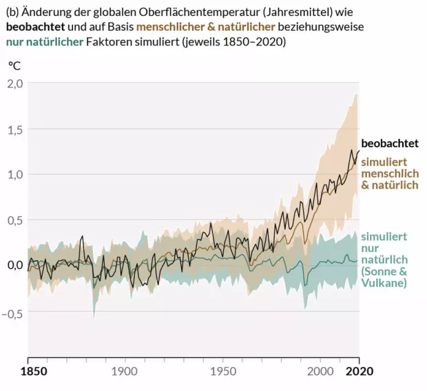 Abbildung 2: Vergleich von Realität und Modellergebnissen - die schwarze Kurve zeigt real beobachtete Temperaturen (bzw. ihre Abweichung vom langjährigen Mittel) zwischen 1850 und 2020, türkis dargestellt sind die Ergebnisse von Modellen, die nur natürliche Klimafaktoren berücksichtigen, braun eingezeichnet sind Ergebnisse von Modellen, die neben den natürlichen Faktoren auch den menschlichen Einfluss (Emissionen an Treibhausgasen oder Abholzung von Wäldern) berücksichtigen; Quelle: IPCC 2021, AR6, WG 1, SPM, Figure 1b