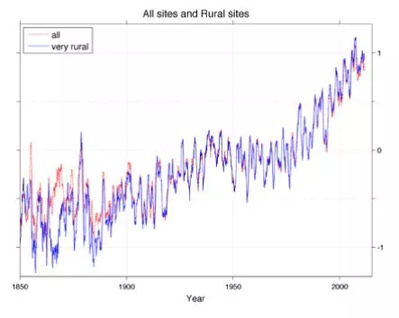 Abbildung 7: Unterschied zwischen Temperaturdaten „sehr ländlicher“ (blau) und aller (rot) Messstationen des Berkeley-Earth-Projekts (dargestellt als Abweichung vom Mittelwert 1950-1980) Quelle: Wickham et al. 2013