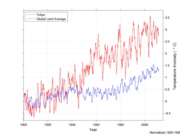 Abbildung 5: Entwicklung des Jahresmittels der Temperaturen seit 1900 in Tokio (rot) und weltweit (blau). Quelle: Wickham et al. 2013
