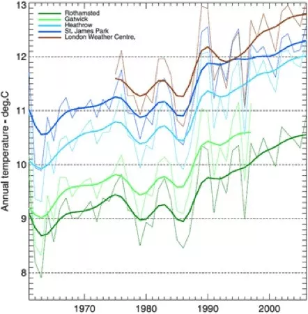 Abbildung 3: Jährliche Temperaturentwicklung an fünf Messstationen in und um London – die städtischen Standorte London Weather Centre (braun) und St. James Park (dunkelblau) zeigen das höchste Temperaturniveau, das ländliche Rothamsted (dunkelgrün) das niedrigste, dazwischen liegen die Stationen an den Flughäfen Heathrow und Gatwick, der jahrzehntelange Entwicklungstrend aber verläuft weitgehend parallel; Quelle: Jones et al. 2008