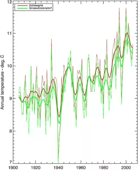 Abbildung 4: Jährliche Temperaturentwicklung an zwei Messstationen in Wien – die Werte von Hohe Warte im Stadtzentrum (braun) liegen höher als jene im ländlichen Groß Enzersdorf (grün), aber die Tendenz ist gleich; Quelle: Jones et al. 2008