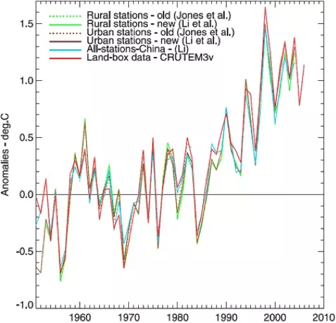 Abbildung 6: Temperaturtrends in China zwischen 1951 und 2004 – grün und grün gepunktet dargestellt sind die Daten von jeweils 42 ländlichen Messstationen, braun und braun gepunktet die (homogenisierten) Daten von 42 bzw. 40 städtischen Stationen, die blaue Kurve beruht auf (unbereinigten) Daten von 728 städtischen und ländlichen Stationen, die rote auf dem Datensatz CRUTEM3v des britischen Hadley-Centers (die Grafik zeigt eine Abweichung der einzelnen Jahre vom Temperaturdurchschnitt der Basisperiode 1954-83;. Quelle: Jones et al. 2008