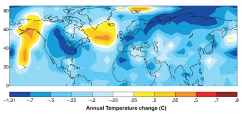 - Sie übertreibt die Auswirkungen der historischen Sonnenminima. Wie bei allen Klimaentwicklungen, so gab es auch damals starke regionale Unterschiede. US-Wissenschaftler zum Beispiel kamen bei einer Untersuchung, wie es global während des besonders extremen Maunder-Minimums aussah (Shindell 2001), nach Auswertung von Proxydaten (etwa aus Baumringen) und einer Modellierung der damaligen Klimabedingungen zu dem übereinstimmenden Ergebnis: In einigen Regionen gab es eine drastische Abkühlung, beispielsweise in Mitteleuropa oder Teilen Nordamerikas, in anderen Erdgegenden aber änderten sich die Temperaturen kaum oder stiegen gar (siehe Abbildung 2). Global gesehen war die Abkühlung während des Maunder-Minimums also relativ schwach, die Erdmitteltemperatur sank um lediglich 0,3 bis 0,4 Grad Celsius – und ein Gutteil davon ist auf die heftigen Vulkanausbrüche während der "Kleinen Eiszeit" zurückzuführen (s.o.). Eine spätere umfassende Analyse solcher Proxydaten aus den vergangenen 2.000 Jahren erbrachte ebenfalls keine Hinweise dafür, dass es sich bei der sogenannten „Kleinen Eiszeit“ um eine weltweite Kältephase gehandelt hat (Neukom et al. 2019)