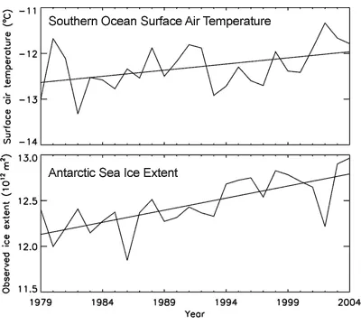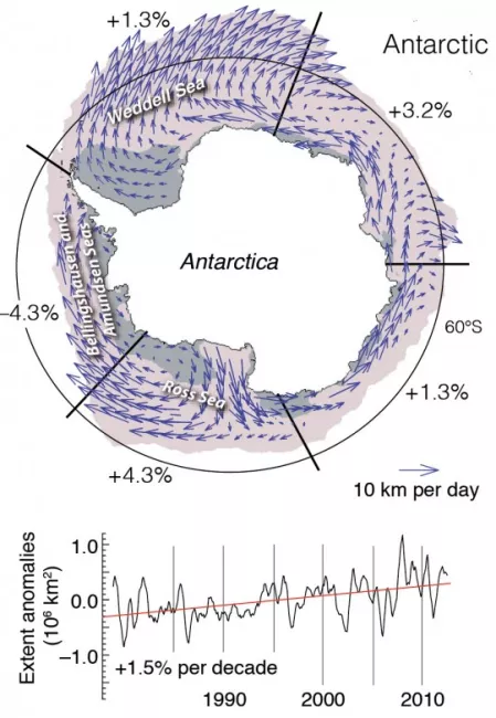 Die Antarktis und ihr Meereis sind sehr komplexe Phänomene. Über den Zeitraum, für den verlässliche Daten vorliegen (ab 1973 nach Beginn von Satellitenmessungen), lässt sich kein Trend der Eisbedeckung des antarktischen Ozeans feststellen – obwohl (oder paradoxerweise gerade weil) auch rings um den Südpol die Erderwärmung bereits deutlich spürbar ist. Jedenfalls wäre der Eindruck falsch, eine zwischenzeitlich beobachtete Zunahme der antarktischen Meereisfläche widerlege die Realität des Klimawandels.