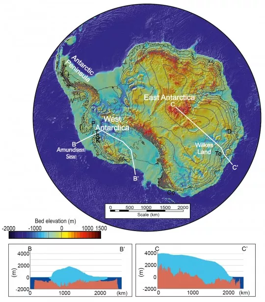 Abbildung 3: Topografie der Antarktis unter dem Eisschild – bläulich eingefärbt in der oberen Grafik sind jene ausgedehnten Bereiche, in denen die Basis des Eisschildes unterhalb des Meeresspiegels liegt. Die beiden unteren, kleinen Grafiken zeigen die Profile entlang der Linien B-B‘ und C-C‘, wie sie in der oberen Grafik eingezeichnet sind; Quelle: IPCC 2013, AR5, WG1, Kap.4, Abb.18 (Ausschnitt)