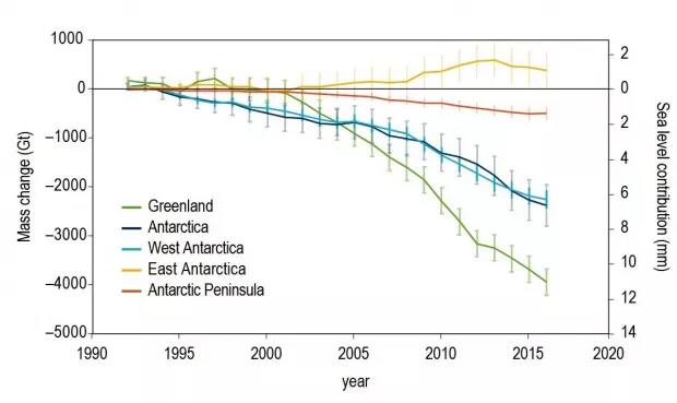 Abbildung 1: Kumulierter Masseverlust des Festlandeises der Antarktis zwischen 1992 und 2016 (linke Skala in Gigatonnen, rechte Skala in „Sea Level Equivalent“, also umgerechnet darauf, welchem Anstieg der Meeresspiegel die geschmolzene Eismasse entspricht). Gezeigt sind die jährlichen Durchschnittswerte auf der Basis zweier, voneinander unabhängiger Studien. Die verschiedenen Kurven stehen für verschiedene Teile der Antarktis (die hellgrüne stellt jedoch den Eisverlust auf Grönland dar), mit senkrechten Striche sind die jeweiligen Unsicherheitsmargen der Einzeldaten markiert; Quelle: IPCC 2019, SROCC, Kapitel 3, Grafik 3.7a