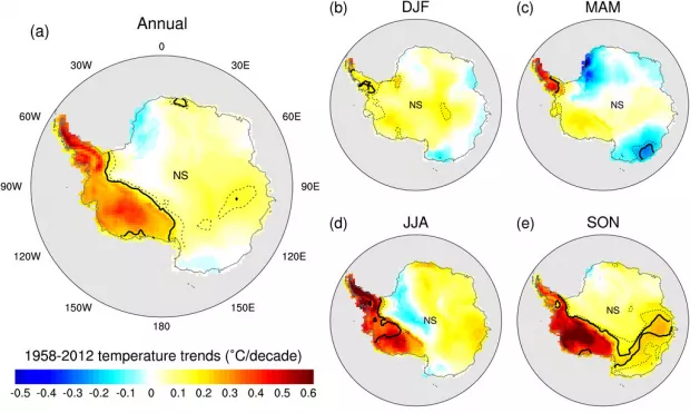 Abbildung 1: Erwärmungstrends in der Antarktis 1958-2012 in Grad Celsius pro Dekade, der Westen des Kontinents zeigt einen besonders starken Temperaturanstieg (erkennbar an der roten Einfärbung). Dargestellt ist zum einen die Entwicklung der Jahresdurchschnittstemperatur (große Grafik links), zum anderen einzelne Quartale (kleine Teilgrafiken, „DJF“ steht für die Monate Dezember, Januar, Februar und so weiter); Quelle: Nicolas/Bromwich 2014