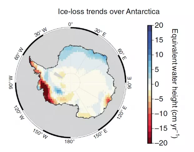 Allerdings ist die Entwicklung in verschiedenen Regionen der Antarktis unterschiedlich. Die detailliertesten Daten zum Landeis lieferte zwischen 2002 und 2017 eine deutsch-amerikanische Satellitenmission namens GRACE („Gravity Recovery and Climate Experiment“). Mittels zweier Satelliten vermaß sie extrem genau die Schwerkraft der Erde, woraus sich die Masse an der Erdoberfläche (beispielsweise von Eis) ableiten lässt – und durch wiederholte Messungen kommen dann zeitliche Veränderungen zum Vorschein. Mittlerweile gibt es eine Nachfolgemission namens GRACE-FO, die seit Mitte 2018 den Job der beiden GRACE-Satelliten übernommen hat. Die GRACE-Daten zeigen, dass der Eisverlust in der Antarktis ungleich verteilt ist (Abbildung 2): Während im Osten des Kontinents die Eismasse sogar leicht zunimmt, ist im Westen eine teils drastische Abnahme zu beobachten (King et al. 2012, Tapley et al. 2019).