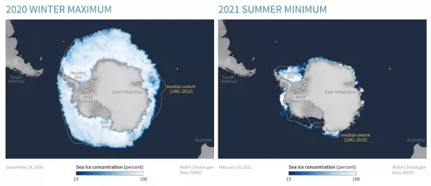 Abbildung 4: Links die größte Ausdehnung des antarktischen Meereises im dortigen Winter 2020, rechts die minimale Ausdehnung im folgenden antarktischen Sommer 2021; Quelle: NOAA/NSIDC