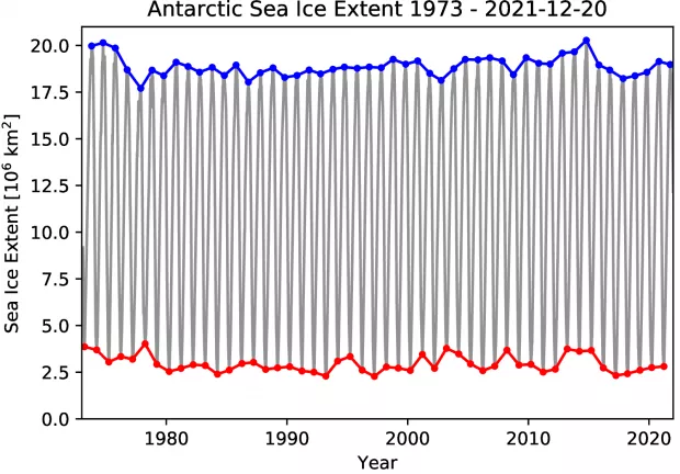 Abbildung 5: Jahr-zu-Jahr-Schwankungen der Meereis-Ausdehnung rund um die Antarktis zwischen Anfang 1973 und Ende 2021 - die graue Zick-Zack-Linie zeigt den Jahresverlauf, die blaue Kurve die jährliche Maximal-Ausdehnung (jeweils erreicht im Februar/März), die rote Kurve die jeweils jährliche Minimal-Ausdehnung (im September jedes Jahres); Quelle: AWI/Universität Bremen