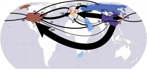 Die großen CO2-Ströme des Welthandels: Mit der Globalisierung hat der internationale Austausch von Waren stark zugenommen und mit ihnen ein Phänomen, das "indirekte Emissionstransfers" genannt wird. Bei der Herstellung von Gütern fällt nämlich teils viel CO2 an, das in den üblichen Klimabilanzen den Produktionsländern zugeschlagen wird. Hingegen würden bei einer konsum-basierten Bilanzierung die CO2-Emissionen durch bestimmte Waren jenen Ländern zugeschlagen, in denen diese Waren verbraucht werden. Die Grafik zeigt schematisch, wie viel CO2-Emissionen aus Produktions- in Konsumtions-Länder wandern würden. Die Ziffern beziehen sich auf Millionen Tonnen Kohlendioxid, und alle Zahlen basieren auf den Warenflüssen des Jahres 2004, sie liegen inzwischen insgesamt deutlich höher; Quelle: Davis/Caldeira 2010