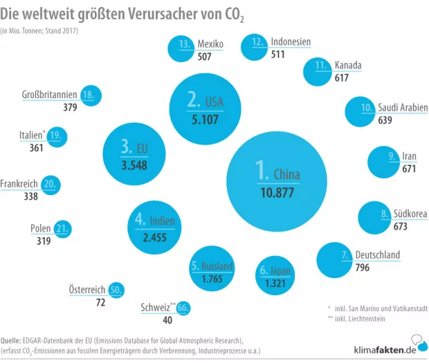 Deutschland gehört zu den zehn größten CO2-Verursachern weltweit, die EU als Gesamtblock liegt sogar auf Platz drei. Und dann soll die Bundesrepublik nur wenig zum weltweiten Klimaschutz beitragen können?; Grafik: klimafakten.de, Datenquelle: EU/EDGAR;