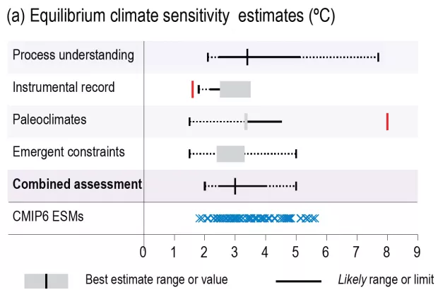 Die Klimasensitivität lässt sich aber auch aus computerbasierten Klimamodellen ermitteln, indem die Wirkung eines verdoppelten CO2-Gehalts „durchgerechnet“ wird. Die Ergebnisse, die bislang mit dieser Methode gewonnen wurden, lagen tendenziell etwas höher als Ergebnisse anderer Methoden. Um eine bestmöglich fundierte Abschätzung der Klimasensitivität zu bekommen, fasst der IPCC die Erkenntnisse aus verschiedenen Forschungssträngen in seinen Sachstandsberichten systematisch zusammen. In Band 1 seines Sechsten Berichts von 2021 (in Kapitel 7.5.5) hat er dies getan – siehe Abbildung 1: