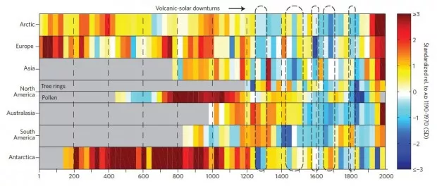 „Die Zeit zwischen etwa 830 bis 1100 war in allen vier Teilregionen der Nordhalbkugel eine anhaltende Warmperiode. In Südamerika und Australien/Asien trat eine durchgehend warme Periode von etwa 1160 bis 1370 auf. In der Arktis und in Europa waren die Temperaturen während der ersten Jahrhunderte nach Christus relativ hoch.“