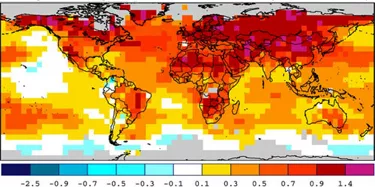 Wie fällt ein Vergleich mit den gegenwärtigen globalen Temperaturen aus? Abbildung 2 zeigt, wie viel wärmer die einzelnen Regionen der Erde zu Anfang des 21. Jahrhunderts (Dekade von 1999 bis 2008) im Vergleich zum Referenzzeitraum der oben zitierten Studie (Durchschnitt von 1961 bis 1990) waren. Auffällig ist die großflächige Erwärmung in nur wenigen Jahrzehnten (mit einzelnen Ausnahmen, etwa der Abkühlung im Südpolarmeer).