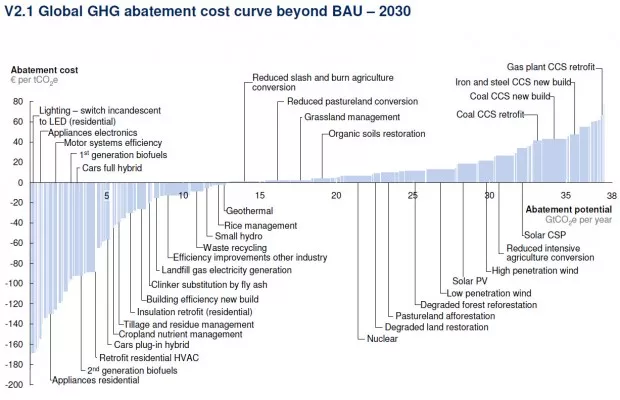 Laut dieser Untersuchung ließe sich durch gewinnbringende oder sehr preiswerte Maßnahmen (blaue Balken im negativen Bereich oder so knapp im positiven) der jährliche Treibhausgasausstoß weltweit um 15 bis 20 Milliarden Tonnen CO2eqsenken. Bei weltweiten Gesamtemissionen von 49 Milliarden Tonnen CO2eq wären bereits dies Minderungen in einer Größenordnung von 30 bis 40 Prozent. Aber auch deutlich höhere Emissionssenkungen sind zu moderaten Kosten möglich. Dabei ist zu beachten, dass diese Kosten durch positive Nebenfolgen der Maßnahmen oder die vermiedenen Schäden durch einen stärkeren Klimawandel teilweise oder gar vollständig aufgewogen werden. Grundsätzlich ist zu beachten, dass solche Kurven höchstens eine Momentaufnahme darstellen – dynamische Entwicklungen etwa bei den Energiepreisen sind mit ihnen nicht erfassbar, dasselbe gilt für die Kosten von Klimaschutzmaßnahmen, die ja durch Forschungsfortschritte oder den großtechnischen Einsatz schnell sinken können.