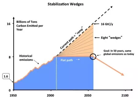 Abbildung 1: Das Konzept der Stabilisierungskeile (engl.: „stabilization wedges“) ist, den gegenüber den heutigen Treibhausgas-Emissionen (blaue Fläche) zu erwartenden Anstieg (das orange Dreieck) in überschaubare Keile (acht Stück in der Grafik) zu zerlegen. Jeder Keil steht für eine technologische Maßnahme, die innerhalb von 50 Jahren die Emissionen um eine Milliarde Tonnen Kohlenstoff (entspricht jeweils rund 3,7 Milliarden Tonnen CO2) mindern könnte; Quelle: Carbon Mitigation Initiative(CMI)